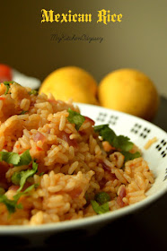Mexican Red Rice - a spicy rice made with chili powder.I am sure this is not a authentic Mexican recipe and is a product of marriage between masala rice and tomato rice.And i call this Mexican red rice as son of masala and tomato rice.